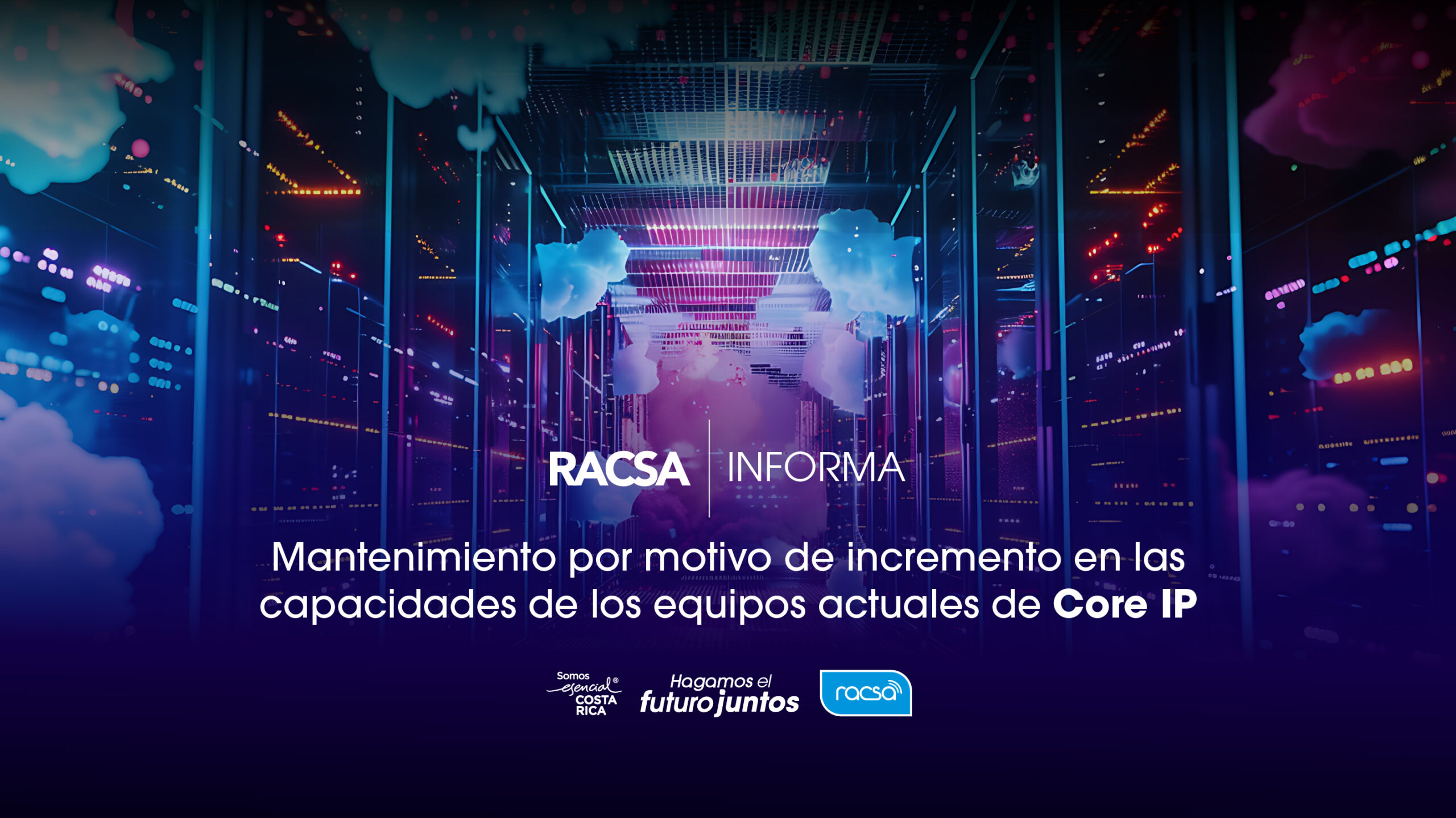 RACSA informa que bajo la gestión de cambio RFC #P2026020010 se realizará la ventana de mantenimiento por motivo de incremento en las capacidades de los equipos actuales de Core IP de RACSA, por lo que no se prevé afectación durante la fecha y hora indicadas.